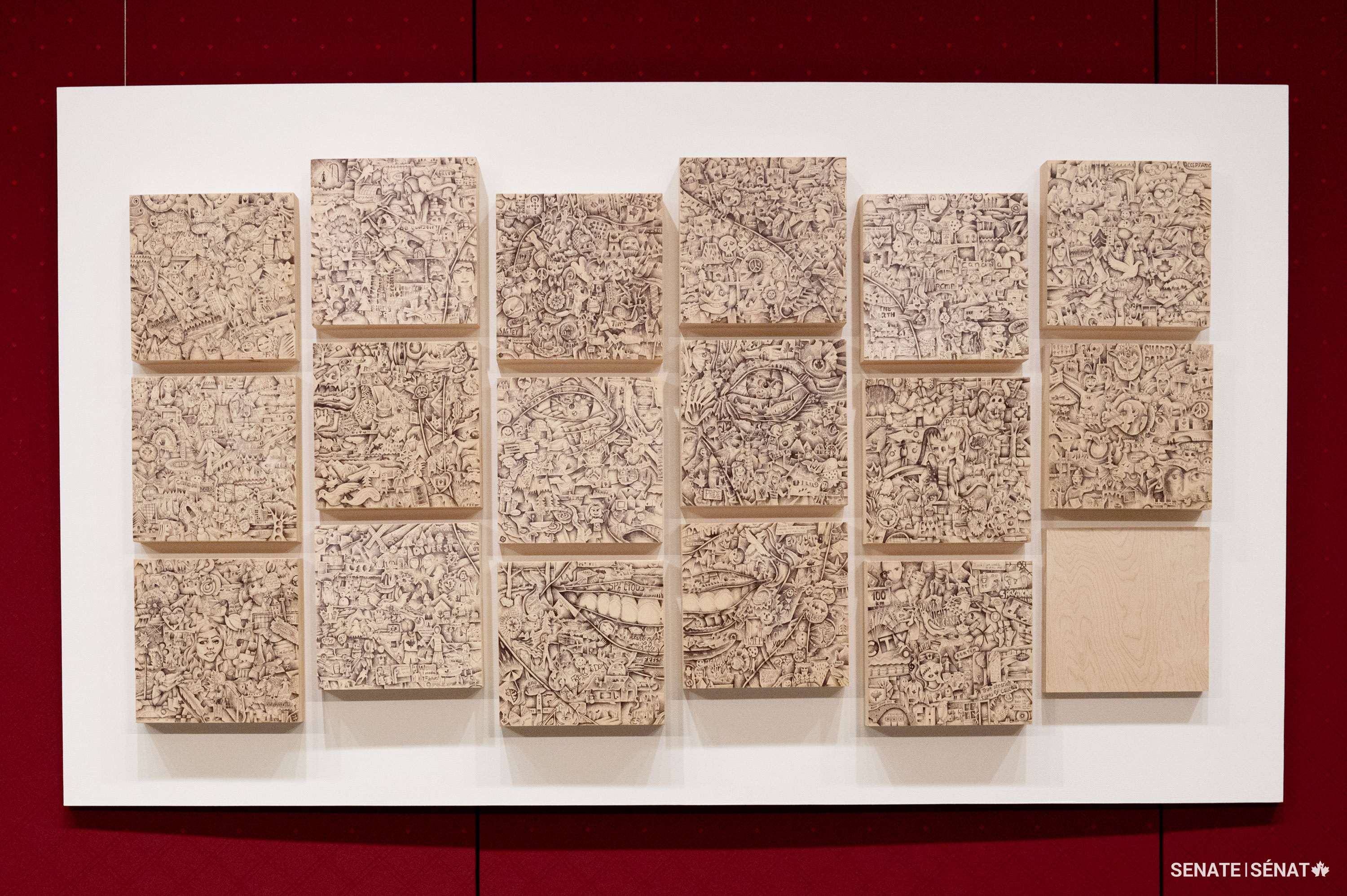 Aquil Virani en collaboration avec Rebecca Jones, détail de L’autoportrait du Canada (2016). 18 panneaux de bouleau et encre. 86,4 cm x 165,1 cm. Provenance du prêt : avec l’autorisation de l’artiste. L’œuvre intègre 800 croquis participatifs illustrant l’identité canadienne.