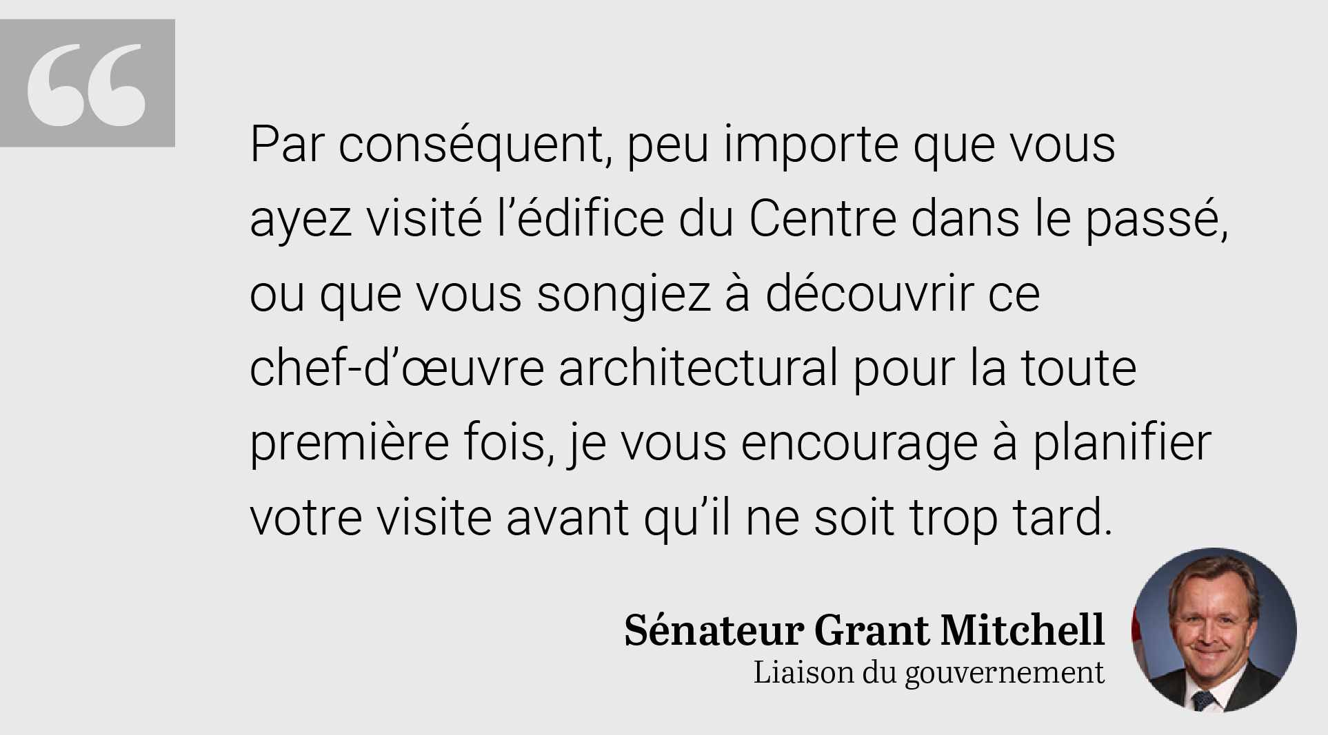 Par conséquent, peu importe que vous ayez visité l’édifice du Centre dans le passé, ou que vous songiez à découvrir ce chef-d’œuvre architectural pour la toute première fois, je vous encourage à planifier votre visite avant qu’il ne soit trop tard. Afin d’en savoir plus sur les visites guidées et d’autres options offertes aux visiteurs de la Colline du Parlement, veuillez consulter le site visit.parl.ca. Nous serons heureux de vous accueillir à Ottawa!