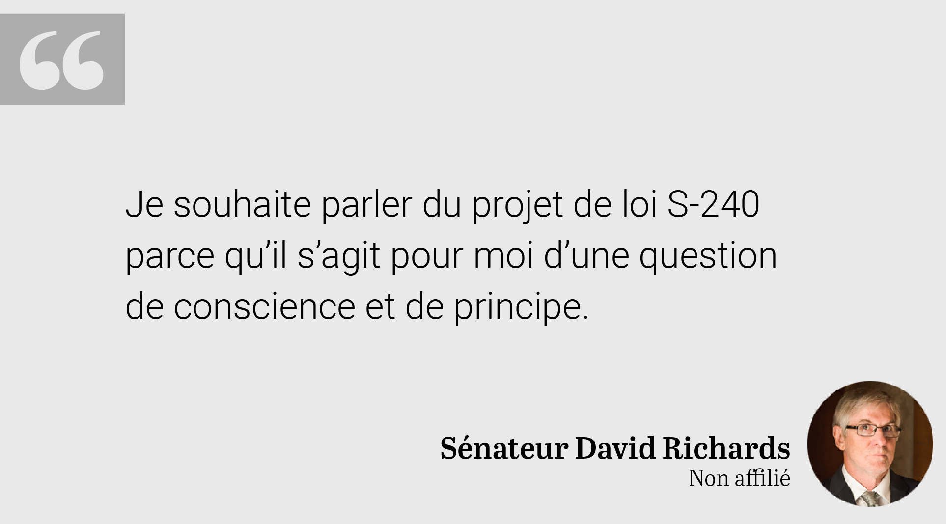 Je souhaite parler du projet de loi S-240 parce qu’il s’agit pour moi d’une question de conscience et de principe, et non pas uniquement une question de statistiques. Je veux dire par là que le nombre de personnes qui ont voyagées dans d’autres pays pour recevoir un organe ne m’intéressait pas particulièrement, pas plus que le manque de moralité au niveau individuel et l’arrogance en tant que facteur de motivation. Je crois toutefois qu’un meilleur accès aux donneurs d’organe au Canada atténuerait le problème, mais je ne suis pas sûr qu’il y mettrait fin définitivement. Je crois aussi qu’un certain nombre de nos immigrants ont peut-être été infectés par une transplantation illégale d’organe.