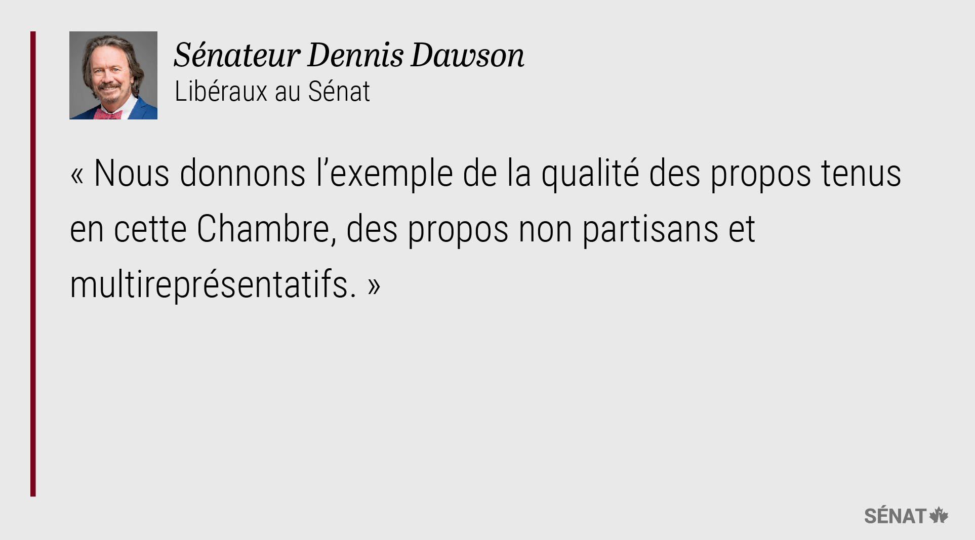 Les Canadiens peuvent enfin voir les sénateurs aussi livrer leurs messages pendant nos délibérations. Nous donnons l’exemple de la qualité des propos tenus en cette Chambre, des propos non partisans et multireprésentatifs.