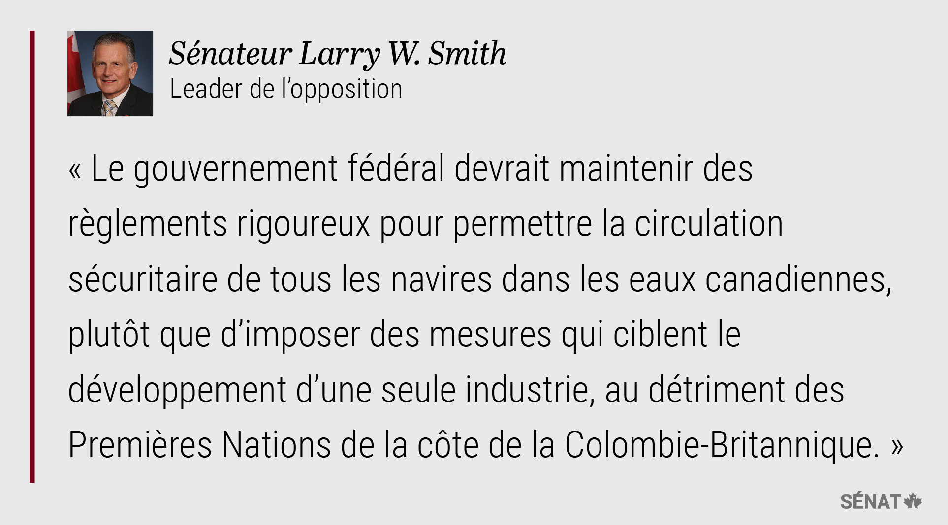 Le gouvernement fédéral devrait maintenir des règlements rigoureux pour permettre la circulation sécuritaire de tous les navires dans les eaux canadiennes, plutôt que d’imposer des mesures qui ciblent le développement d’une seule industrie, au détriment des Premières Nations de la côte de la Colombie-Britannique.