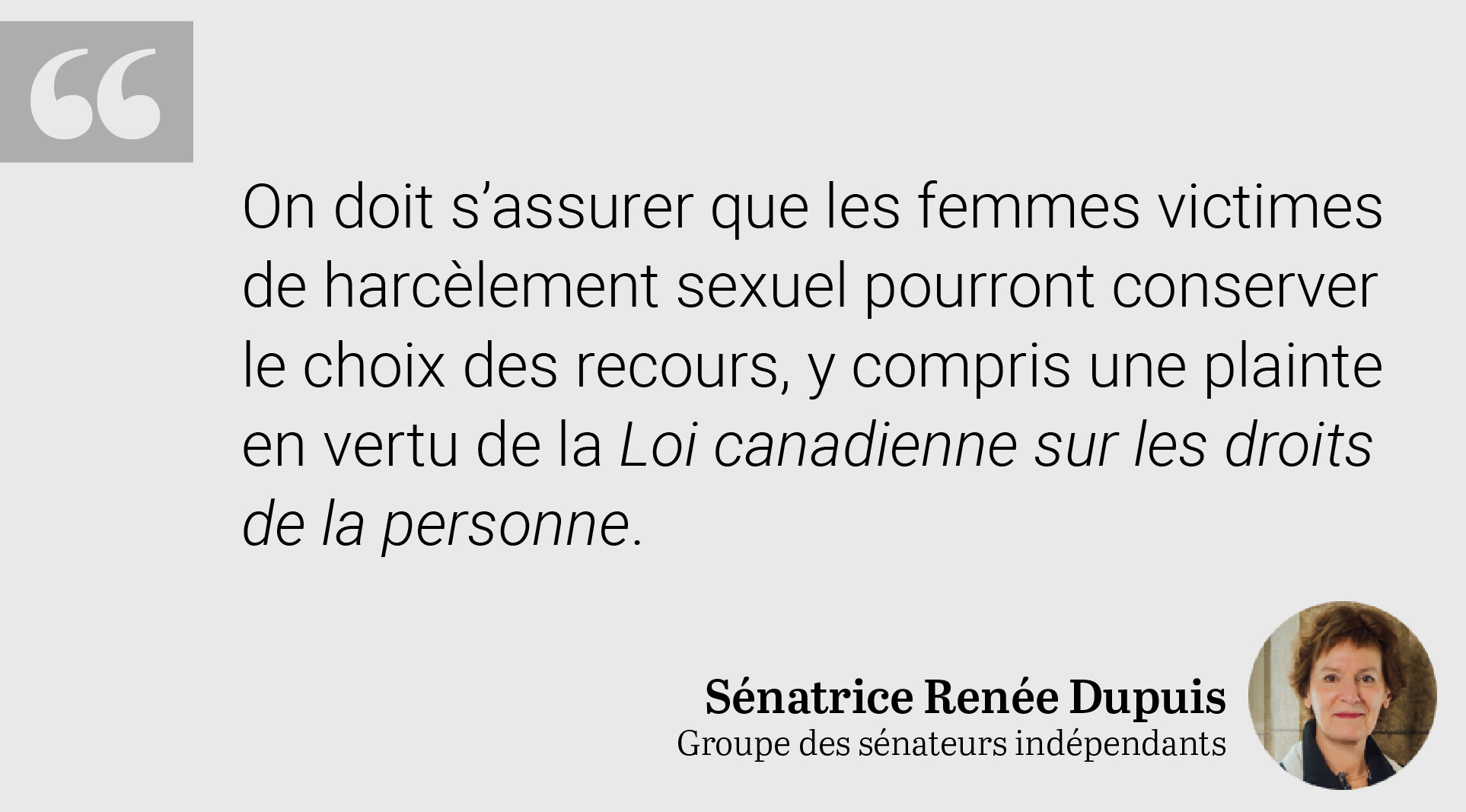 J’appuie l’idée de renforcer les recours offerts aux victimes de harcèlement et de violence sexuelles au travail. Toutefois, on doit s’assurer que les femmes victimes de harcèlement sexuel pourront conserver le choix des recours, y compris une plainte en vertu de la Loi canadienne sur les droits de la personne. Il m’apparaît important de clarifier que ce nouveau régime ne deviendra pas un recours exclusif ni incompatible avec une plainte en matière de discrimination pour cause de harcèlement sexuel. Cela aurait pour effet de banaliser le harcèlement et la violence dont les femmes sont l’objet dans les milieux de travail, en plus de priver les femmes qui la subissent, de recours qu’elles ont obtenu de haute lutte.