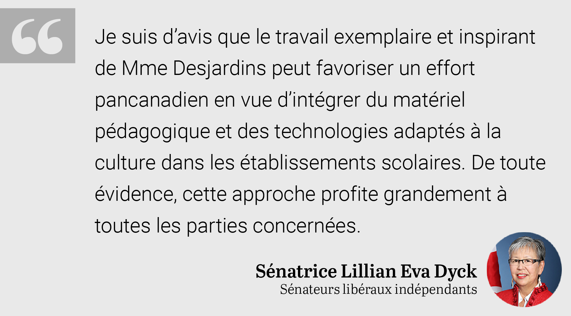 Je suis d’avis que le travail exemplaire et inspirant de Mme Desjardins peut favoriser un effort pancanadien en vue d’intégrer du matériel pédagogique et des technologies adaptés à la culture dans les établissements scolaires. De toute évidence, cette approche profite grandement à toutes les parties concernées.