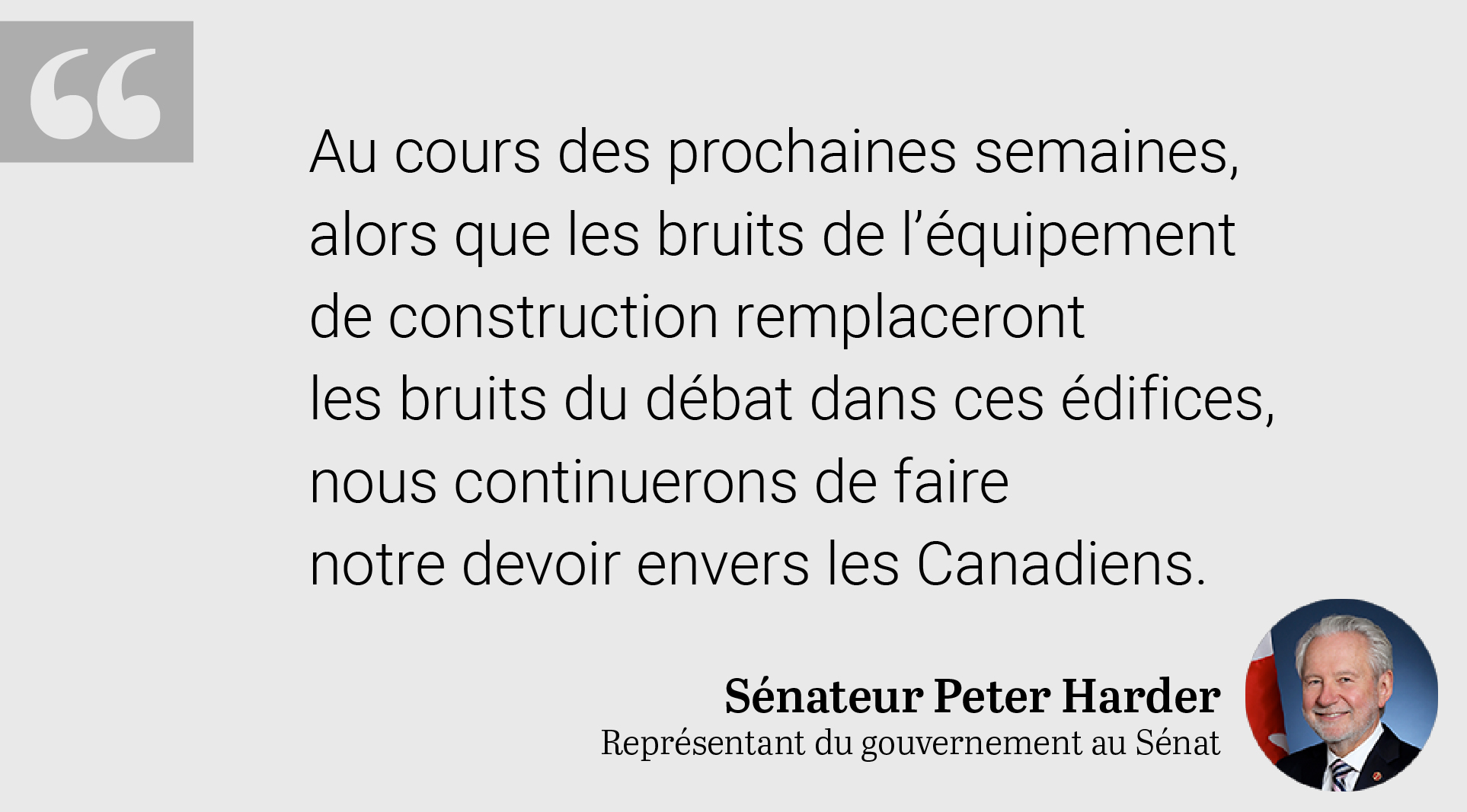 Au cours des prochaines semaines, alors que les bruits de l’équipement de construction remplaceront les bruits du débat dans ces édifices, nous continuerons de faire notre devoir envers les Canadiens.