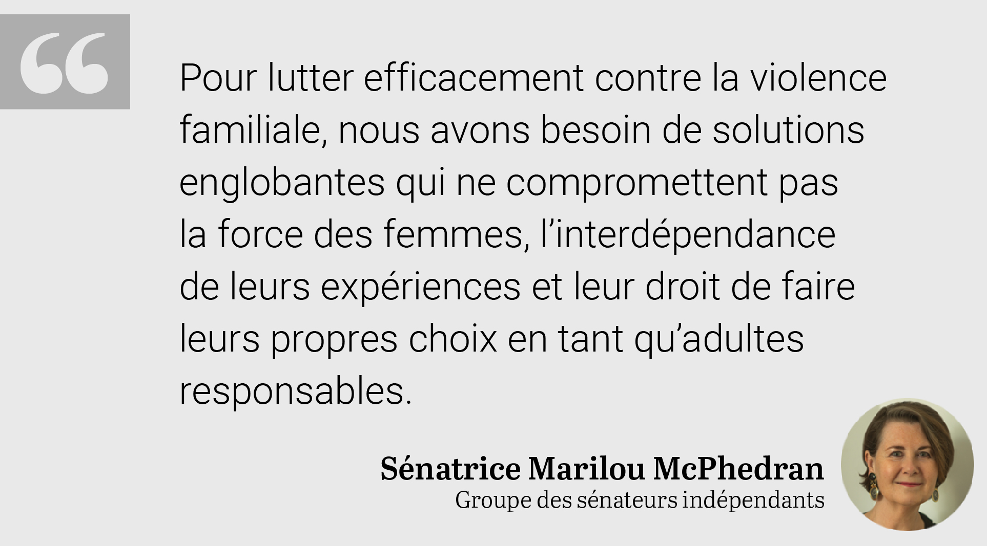Il n’y aura jamais une seule solution législative pour prévenir la violence familiale. Les enjeux sont plus complexes et ont une plus grande portée. Lorsque nous élaborons des solutions législatives et une stratégie nationale pour prévenir la violence familiale, nous devons d’abord et avant tout être diligents et attentifs aux besoins des femmes. Cela signifie que nous ne pouvons tirer des conclusions législatives hâtives sans bien comprendre les répercussions que les femmes et leurs enfants pourraient ressentir.