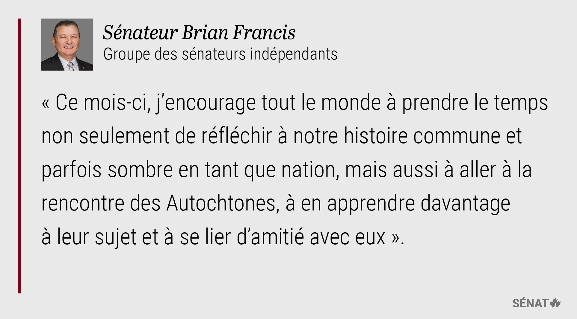 Ce mois-ci, j’encourage tout le monde à prendre le temps non seulement de réfléchir à notre histoire commune et parfois sombre en tant que nation, mais aussi à aller à la rencontre des Autochtones, à en apprendre davantage à leur sujet et à se lier d’amitié avec eux.