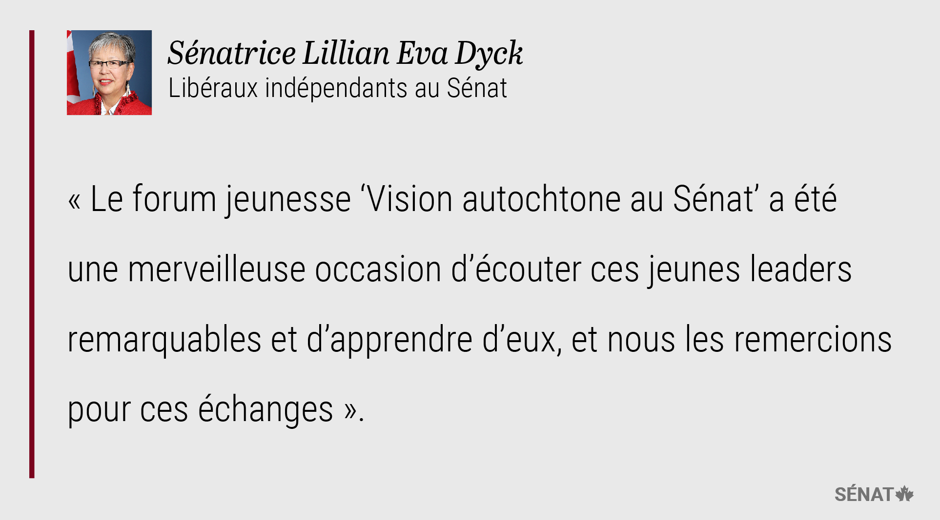 Le forum jeunesse ‘Vision autochtone au Sénat’ a été une merveilleuse occasion d’écouter ces jeunes leaders remarquables et d’apprendre d’eux, et nous les remercions des échanges.