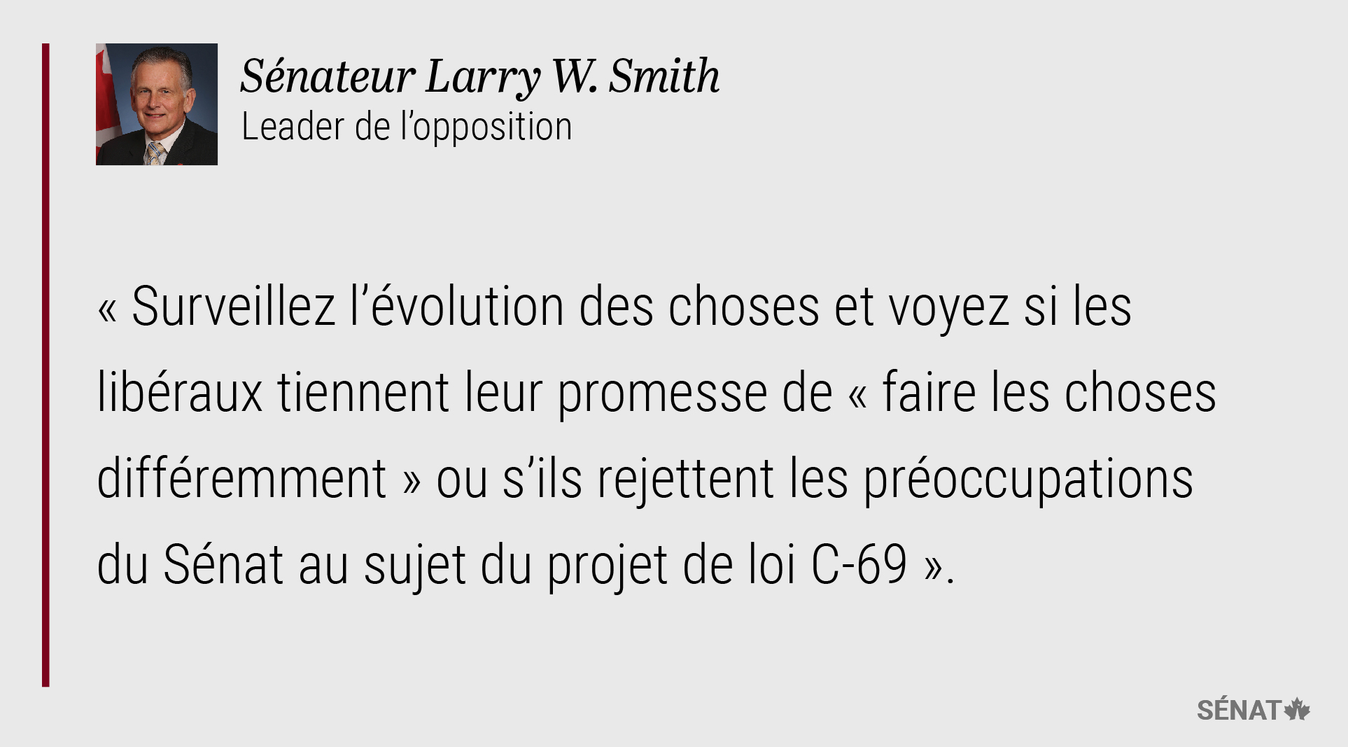 Surveillez l’évolution de la situation et voyez si les libéraux tiennent leur promesse de « faire les choses différemment » ou s’ils rejettent les préoccupations du Sénat au sujet du projet de loi C-69.