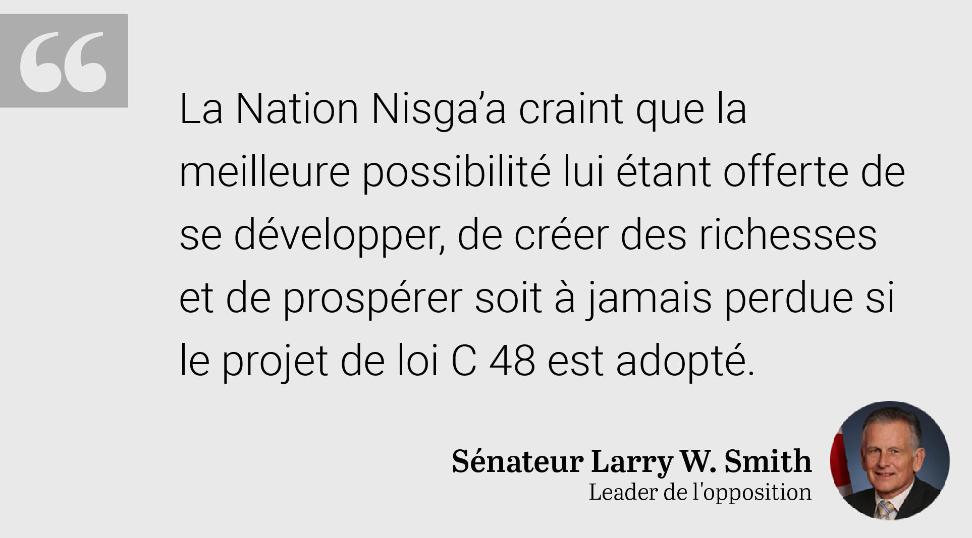 La Nation Nisga’a craint que la meilleure possibilité lui étant offerte de se développer, de créer des richesses et de prospérer soit à jamais perdue si le projet de loi C‑48 est adopté.