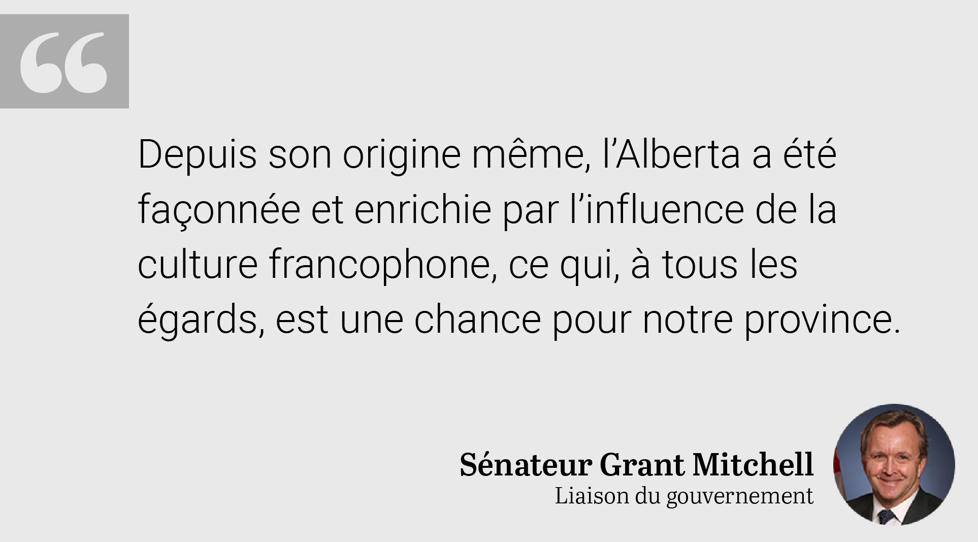 Je suis fier que le gouvernement de l’Alberta ait récemment tenu à mettre en lumière, à reconnaître et à faire fructifier l’atout que représentent la langue française et la culture francophone pour tous les citoyens de l’Alberta et l’ensemble du Canada.