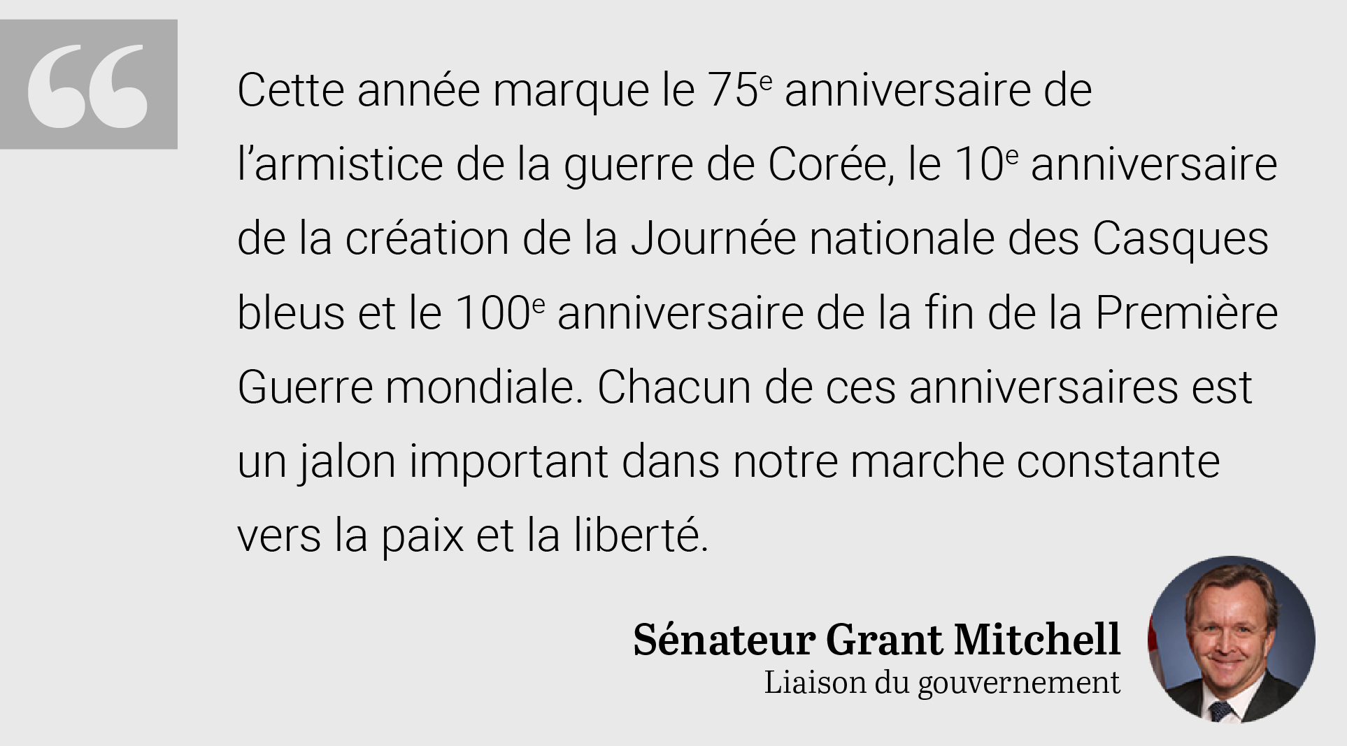 Cette année marque le 75e anniversaire de l’armistice de la guerre de Corée, le 10e anniversaire de la création de la Journée nationale des Casques bleus et le 100e anniversaire de la fin de la Première Guerre mondiale. Chacun de ces anniversaires est un jalon important dans notre marche constante vers la paix et la liberté.