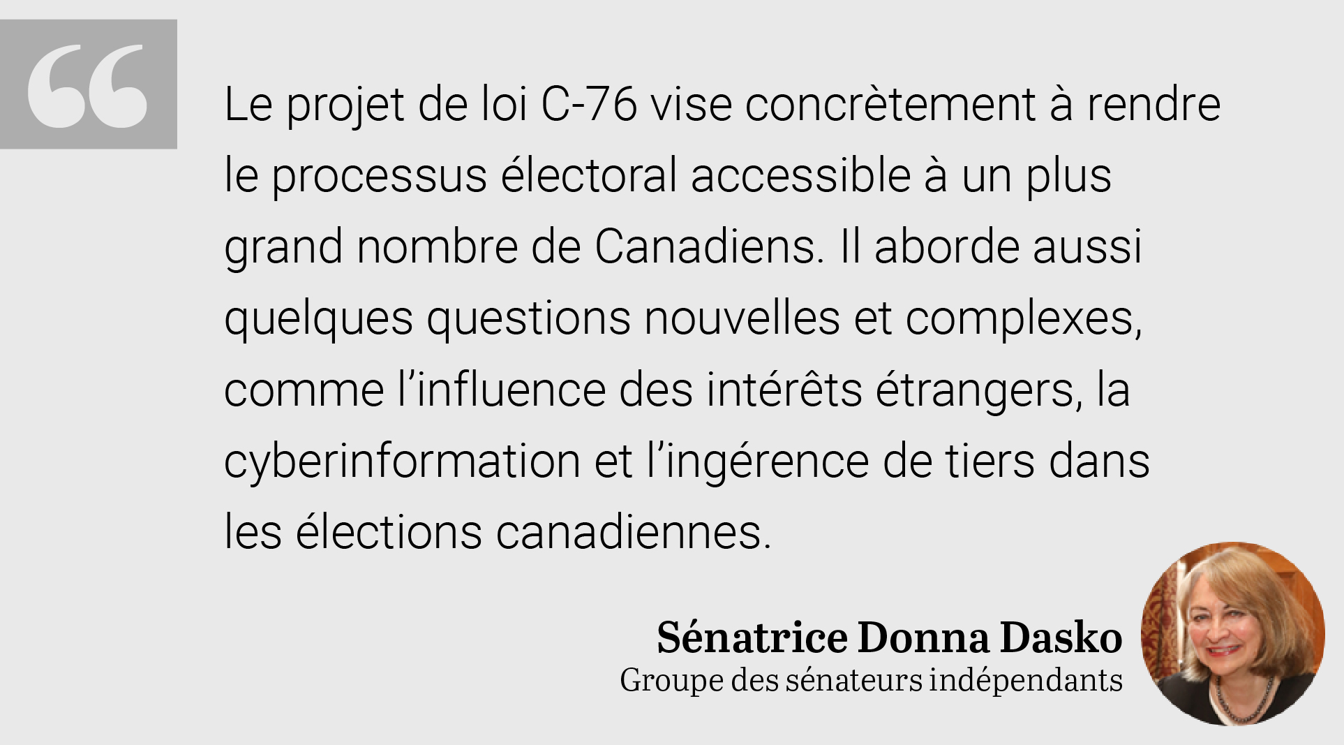 La semaine dernière, le Sénat a renvoyé le projet de loi C‑76, Loi sur la modernisation des élections, en comité. Ce projet de loi prévoit beaucoup de choses. Il vise concrètement à rendre le processus électoral accessible à un plus grand nombre de Canadiens. Il aborde aussi quelques questions nouvelles et complexes en ce qui concerne l’influence des intérêts étrangers, la cyberinformation et l’ingérence de tiers dans les élections canadiennes.
