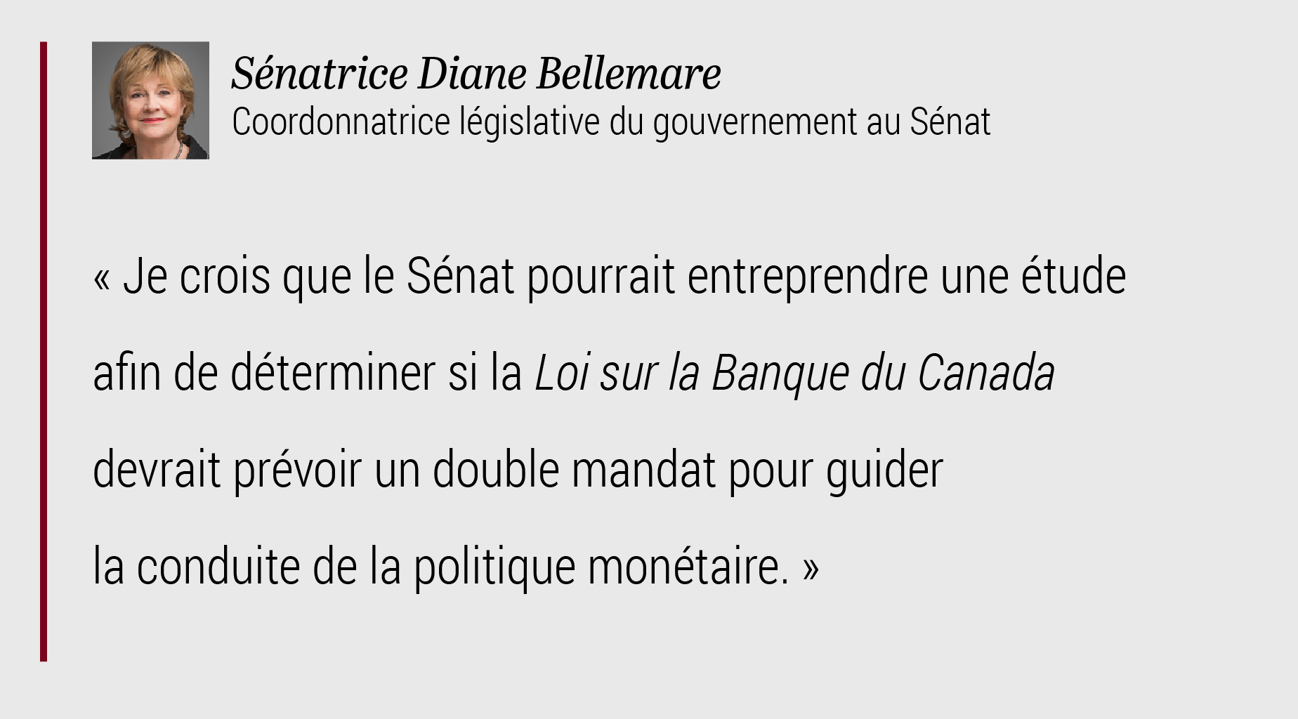 C’est pourquoi je partage le point de vue exprimé dans la lettre signée par 61 économistes canadiens qui demandaient au ministre des Finances de réviser la Loi sur la Banque du Canada de façon à doter la Banque d’un double mandat. La Loi devrait également tenir compte de l’entente signée entre la Banque et le gouvernement du Canada, qui précise les cibles de la politique monétaire. De plus, elle devrait définir la façon dont la Banque doit rendre des comptes aux Canadiens et préciser les limites de son indépendance opérationnelle.