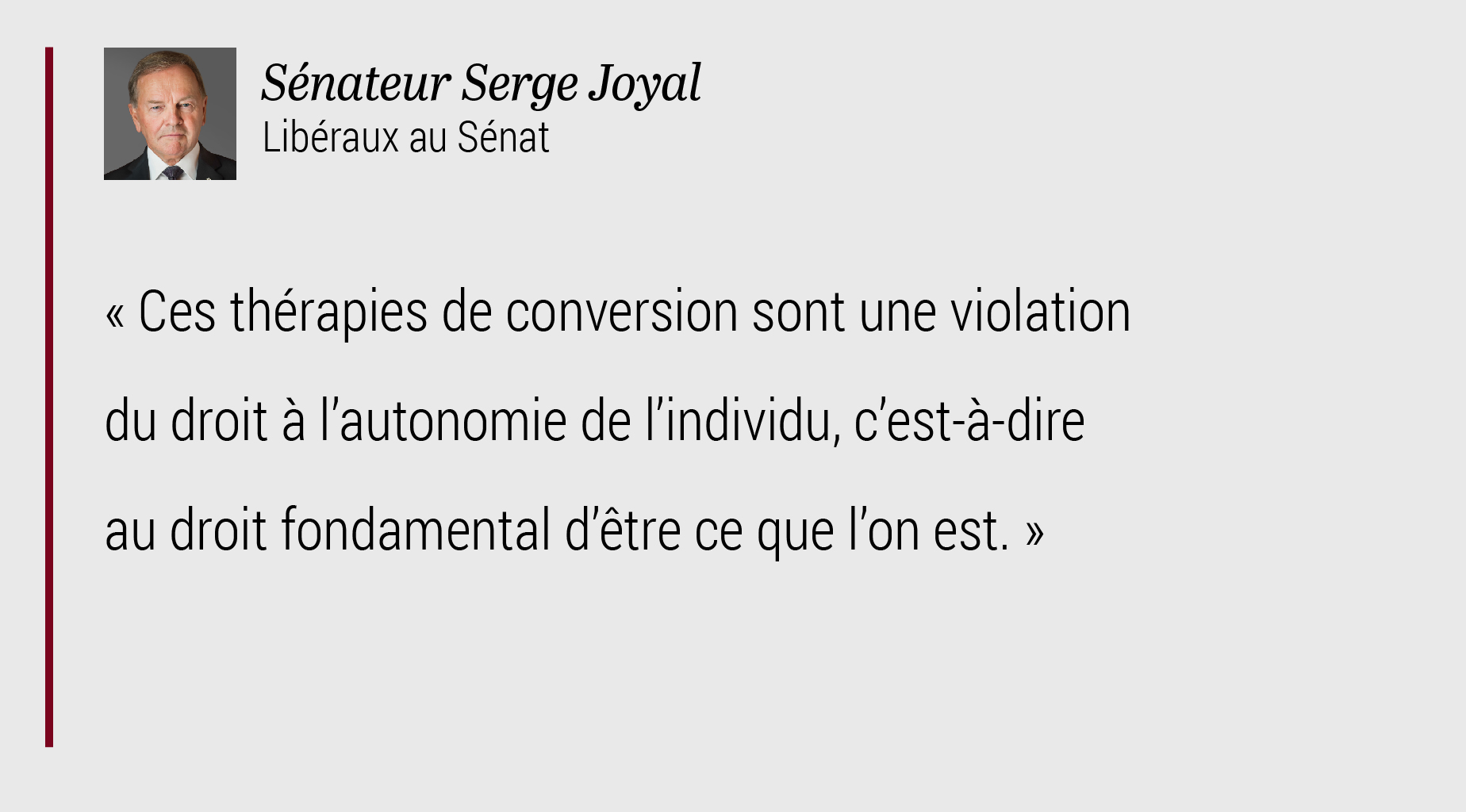 La Charte canadienne des droits et libertés stipule que nous avons tous droit à la dignité et à l’égalité. Or, ces thérapies de conversion sont une violation du droit à l’autonomie de l’individu, à l’intégrité physique et à l’intégrité psychologique – c’est-à-dire le droit fondamental d’être ce que l’on est. La thérapie de conversion contrevient au droit à l’autodétermination. Elle peut causer un préjudice irréparable à une personne et détruire des vies.