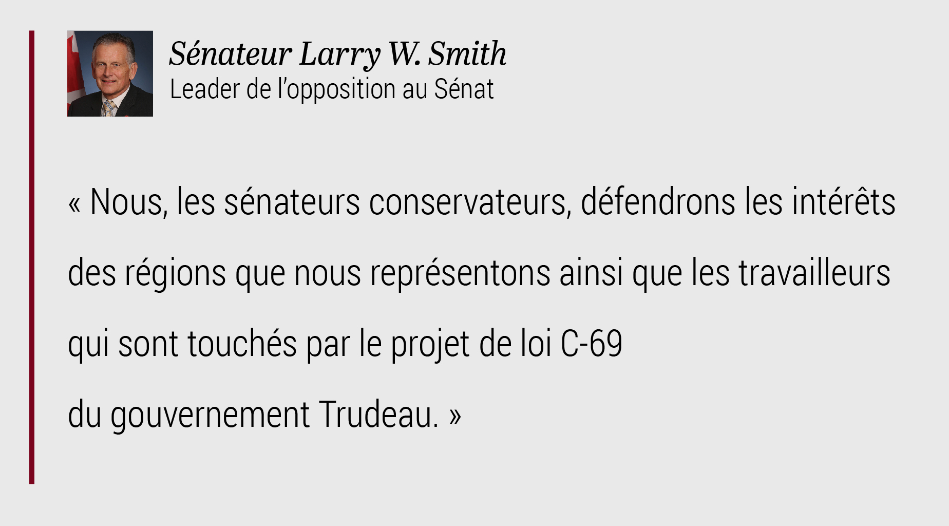 Le gouvernement doit apporter des changements importants au projet de loi : de petits ajustements ne suffiront tout simplement pas. Nous, les sénateurs conservateurs, défendrons les intérêts des régions que nous représentons et des travailleurs qui sont touchés par ce projet de loi du gouvernement Trudeau.