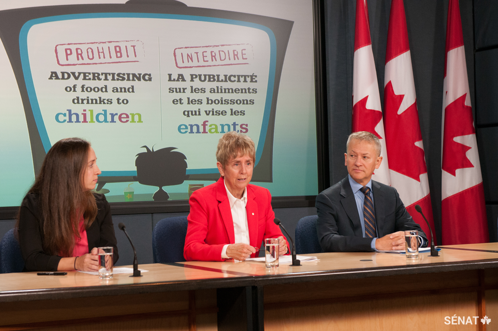 La sénatrice Nancy Greene Raine participe à une conférence de presse pour annoncer son projet de loi d’intérêt public S-228, la Loi sur la protection de la santé des enfants, qui interdirait la publicité sur les aliments et les boissons malsains qui s’adresse aux enfants.