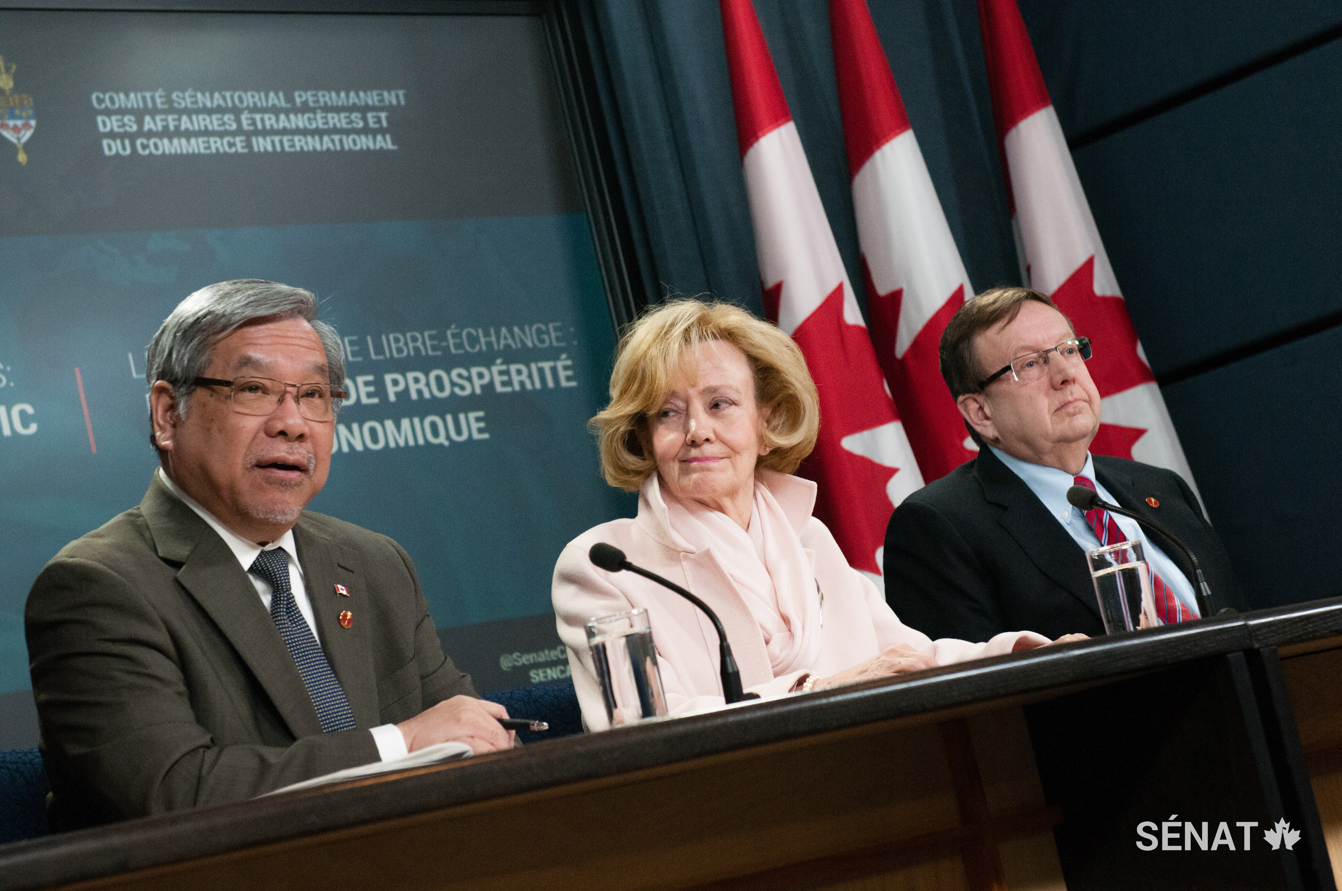 Les sénateurs Thanh Hai Ngo et Percy E. Downe se joignent à la sénatrice Andreychuk lors d’une conférence de presse sur le lancement du rapport du Comité sénatorial des affaires étrangères et du commerce international intitulé Les accords de libre-échange : Un levier de prospérité économique.